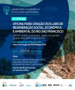 No Dia Nacional da Caatinga (28/04), o projeto HidroSinergia, o Centro Brasil no Clima (CBC), o iCS, o Climainfo e a Prefeitura de Paulo Afonso realizam a Oficina para Criação dos Labs de Regeneração Social, Econômica e Ambiental do Rio São Francisco, tendo como tema Políticas Públicas Interconectadas para impulsionar uma nova economia inclusiva e sustentável. O evento será no formato híbrido com transmissão pela internet a partir do auditório do Instituto Federal de Educação, Ciência e Tecnologia da Bahia (IFBA). Para participar por canal digital basta acessar o link https://forms.gle/yDvP5nM6iAtpnc2Y8.
