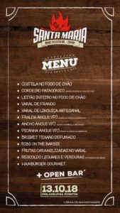 O cardápio é um espetáculo a parte, o festival contará com estações de comidas, como Costela de fogo no chão, Varal de frango, Cordeiro Patagônico, Leitão no fogo de chão, Varal de linguiças artesanais, Picanha, Ancho e Fralda Angus, Brisket texano defumado, Pulled Pork, Ribs on the barbie, Buffalo wings, Varal de frutas caramelizadas, Hambúrguer gourmet, e muito mais.